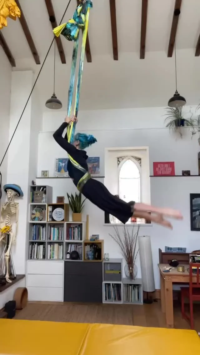 I teach online and in person from home, a converted church near Llangrannog in Ceredigion. I’m also part of the team at Syrcas Byd Bach the circus school at Small World Theatre in Cardigan, and Circus Mobility Parish online membership.