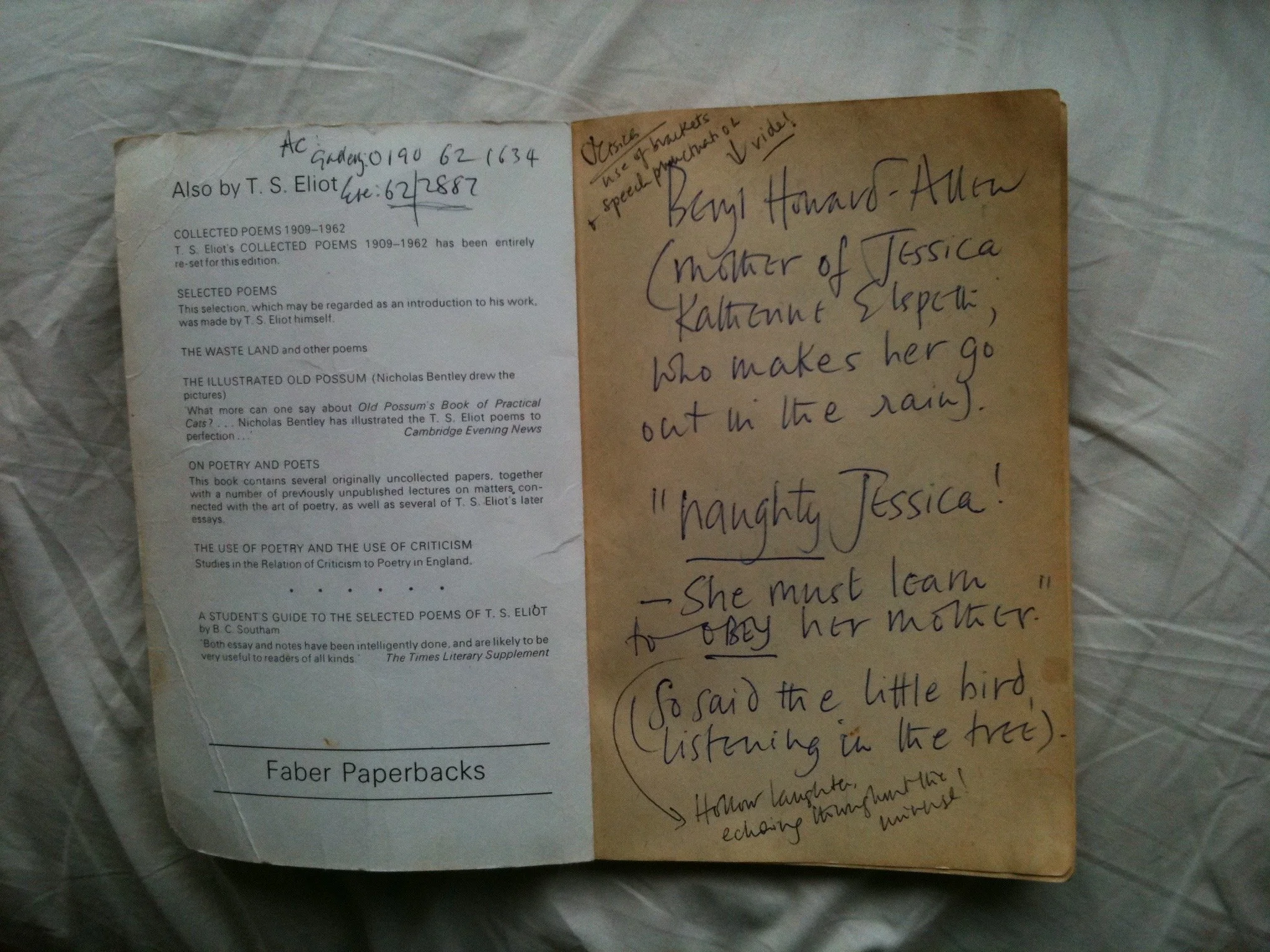 But they held an equal and related significance for me and my mother - an only child and a single parent - as a thread that linked our lives with colourful stories. Our one slim copy of these poems contained my mum’s biro-ed lessons in the use of grammar and punctuation (for me, age 7) on the frontispiece; the scribbled marginalia of her literary analysis and, poignantly, the notes she later wrote in Welsh for her own mother’s epitaph*. This was also the volume that I’d famously picked up age 6 and precociously read out loud from, deceived by its slimness into thinking it was a book for children. All this on the faded armchair where I was so often read to, or slipping down the side of, lulled to sleep by my mother’s sonorous voice on another endless telephone call. One volume, three generations of women, one cat (called Eliot), a telephone and a lot of talking out loud….